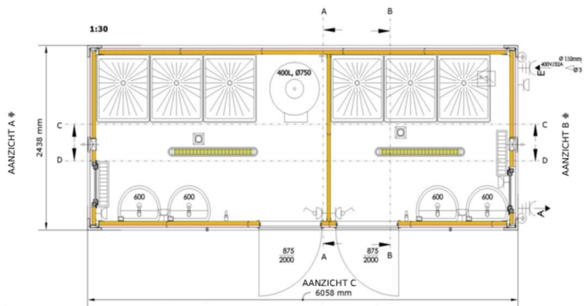 De functionele inrichting van de 20-voet container is volledig afgestemd op de behoeften van de gebruikers. Na hun dienst op de bouwplaats kunnen de werknemers zich hier omkleden en douchen zonder gestoord te worden. Alle douches zijn voorzien van een douchegordijn. Twee wastafels en een eigen verwarming ronden de voorzieningen in het heren- en damesgedeelte af.