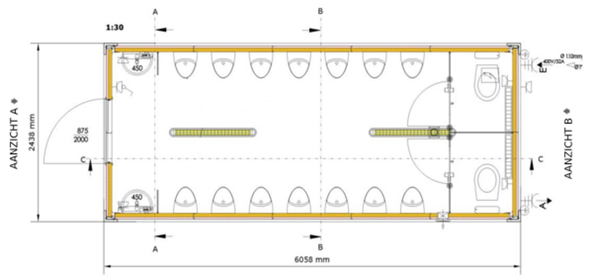 Onze versie die speciaal opgebouwd is voor de mannelijke bezoeker heeft het helemaal: hier kunnen 14 mannen tegelijkertijd naar toilet, in 1 container. Door het inzetten van deze container, vooral bij grote evenementen, worden lange wachttijden vermeden.