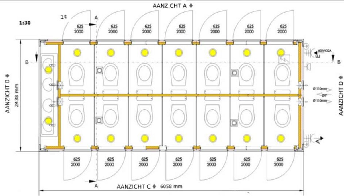 Optimale benutting van de ruimte: bij de WC Container Maxi is aan alles gedacht. Er zijn zeven WC-cabines met een eigen deur aan elk van de twee lange zijden van de sanitaire container. Op de zijde werden er 4 praktisch ingerichte wastafels voorzien.