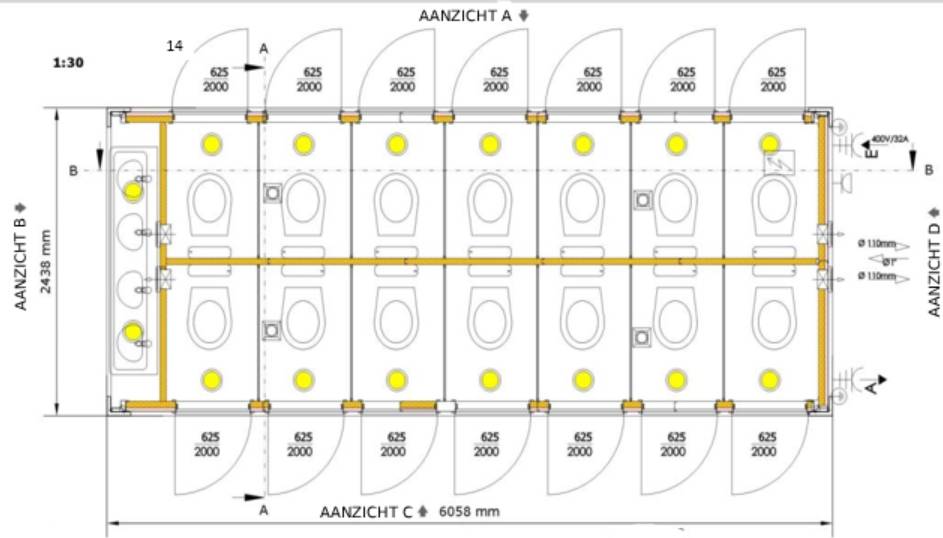 Optimale benutting van de ruimte: bij de WC Container Maxi is aan alles gedacht. Er zijn zeven WC-cabines met een eigen deur aan elk van de twee lange zijden van de sanitaire container. Op de zijde werden er 4 praktisch ingerichte wastafels voorzien.